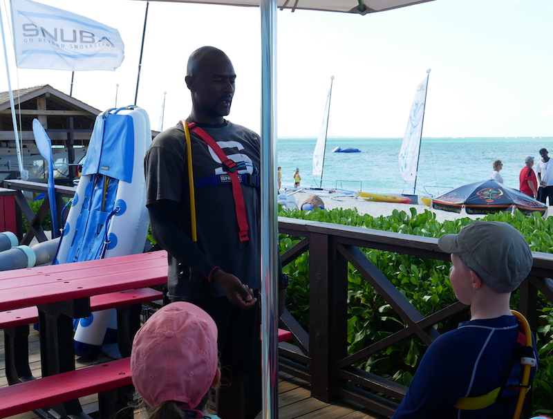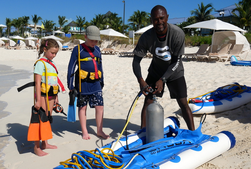 Where SNUBA gets particularly interesting is when you attempt to SNUBA with kids. My two are adventurous but I was quite nervous that SNUBA would be too much for them. We first attempted SNUBA at Beaches Resorts Turks & Caicos. We tried it out for a few minutes in one of the pools. At this point, I realized they could handle being underwater at 4 feet but had no idea what would happen at 20 feet. I decided to throw caution to the wind, sign up for a full session and find out what it was like to SNUBA with kids.